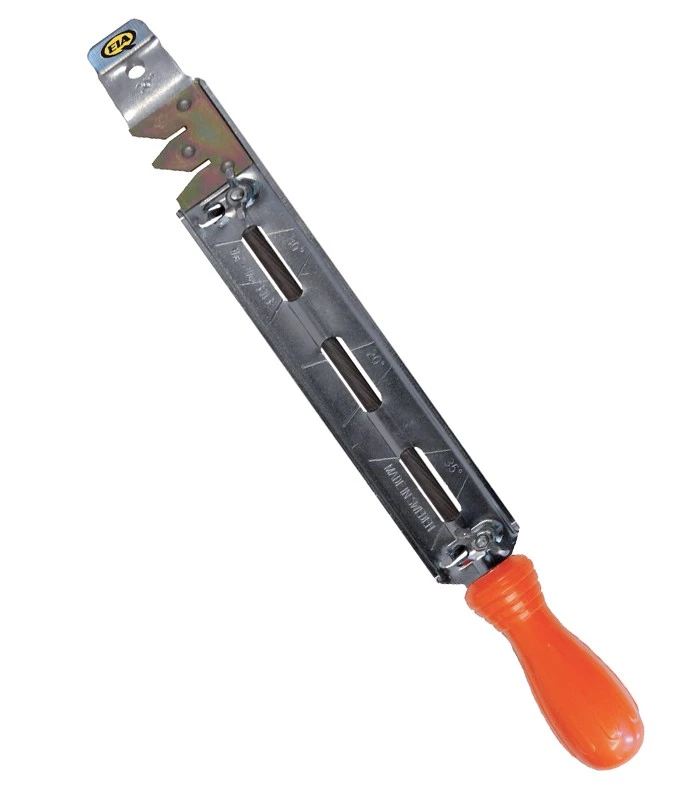 Viilanohjain ja haritusrauta samassa. Viilan kiinnitys kahdella siipimutterilla, joten viilan vaihto käy käden käänteessä. Sopii 1,6 mm ja 1,8 mm paksuille terille. Mukana toimitetaan 1 kpl 5,5 mm pyöröviila.