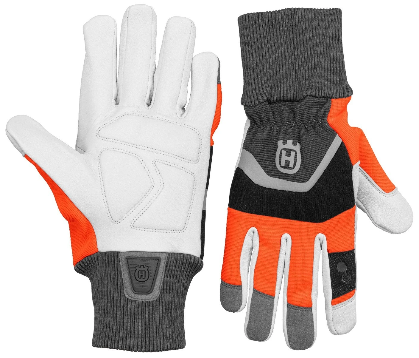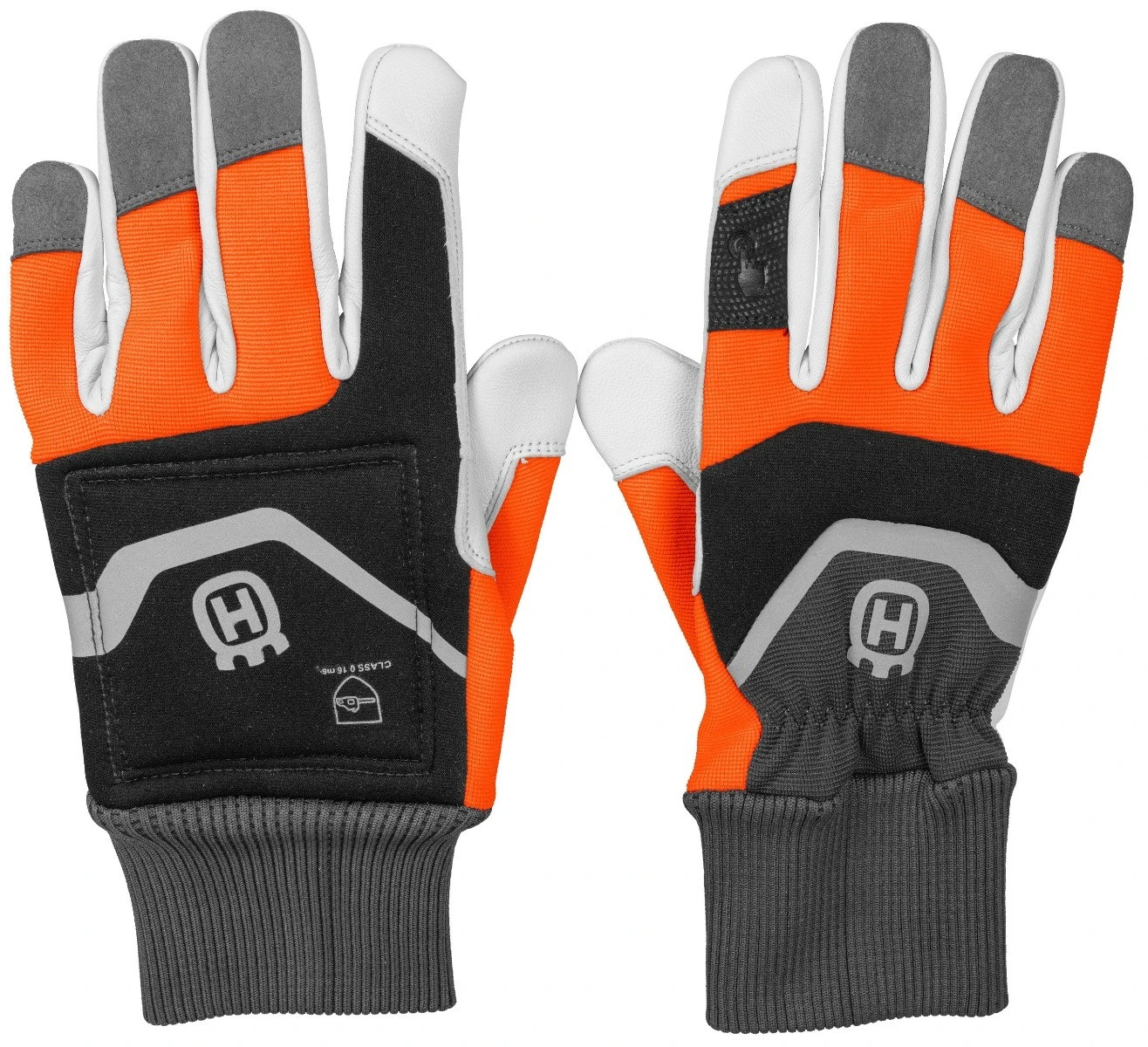 Husqvarna Functional viiltosuojahanskat tarjoavat erinomaisen käyttömukavuuden ja istuvuuden. Vasemmassa kämmenselässä viiltosuoja. Valmistukseen on käytetty vettä hylkivää vuohennahkaa ja kämmenosat on vahvistettu kaksinkertaisesti optimaalisen kulutuskestävyyden takaamiseksi. Käsineissä on joustavat neulotut hihansuut ja kämmenselän puolella oleva huomioväritys helpottaa hanskojen löytymistä.