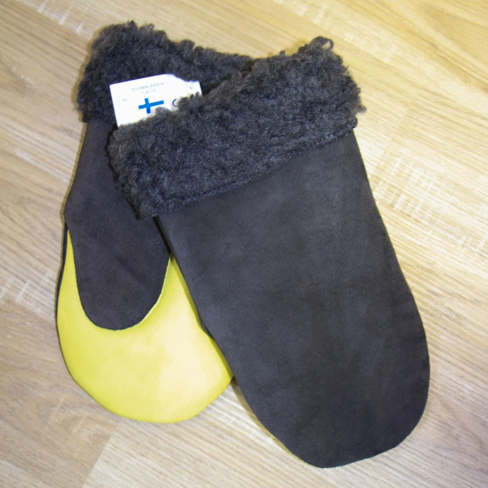 Naistenmalli! Kotimaiset nahkarukkaset keinoturkisvuorella. Suomessa aidosta naudannahasta valmistetut rukkaset ovat todella lämpimät ja kestävät. Selkämys naudan hiottua haljasnahkaa. Kämmen naudan pintanahkaa. Irroitettava vuori.