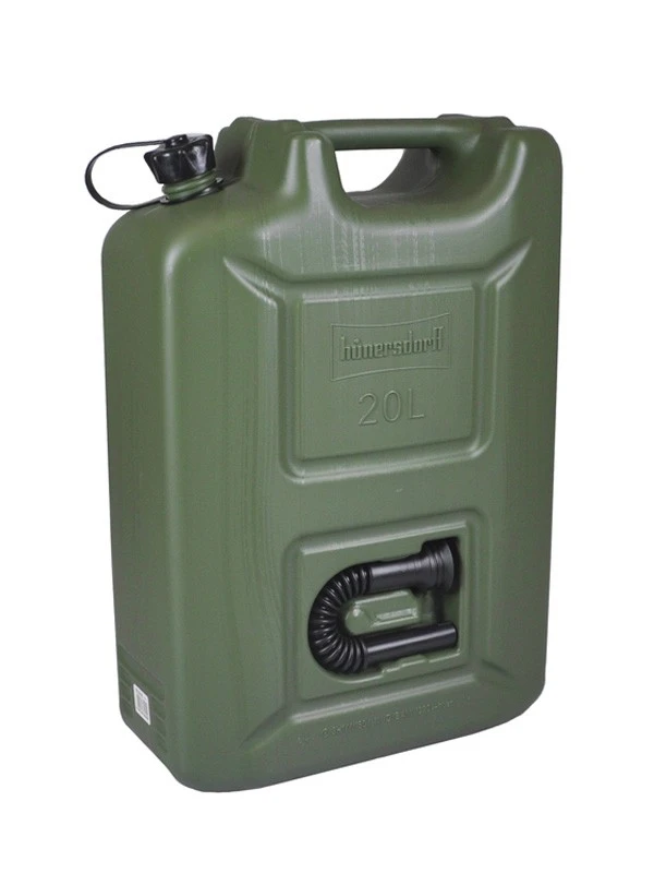 Kestävä ja käytännöllinen oliivin värinen polttoainekanisteri.