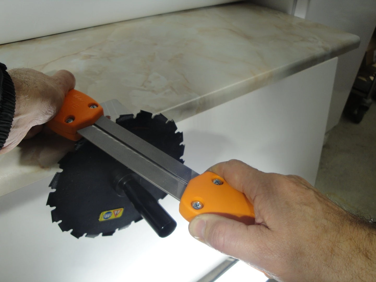 Raivaussahanterien haritukseen, teroitukseen ja kunnostukseen. Kiinnitys pöytään kiristysruuvilla tai puuruuveilla. Teline mahdollistaa kaksin käsin viilaamisen. Runko vahvaa ruostumatonta terästä. Terän teroituskulma ±15 astetta merkitty rungon päälle. Soveltuu Ø 200 mm ja 225 mm terille, joissa keskireikä on 20 mm tai 25,4 mm. Paino: 0,7 kg.