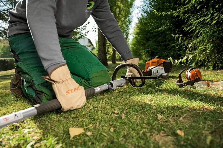 Ammattikäyttöön STIHL ErgoStart, ECOSPEED osakaasuominaisuus, rengaskahva, kantohihna, 2-MIX-Moottori, pysäytysnappi.