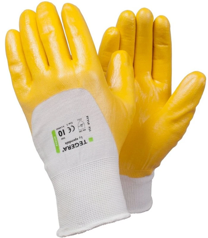 Nitriilipinnoitettu puuvillakäsine resorirannekkeella suojaa käsiä istuksen yhteydessä.
