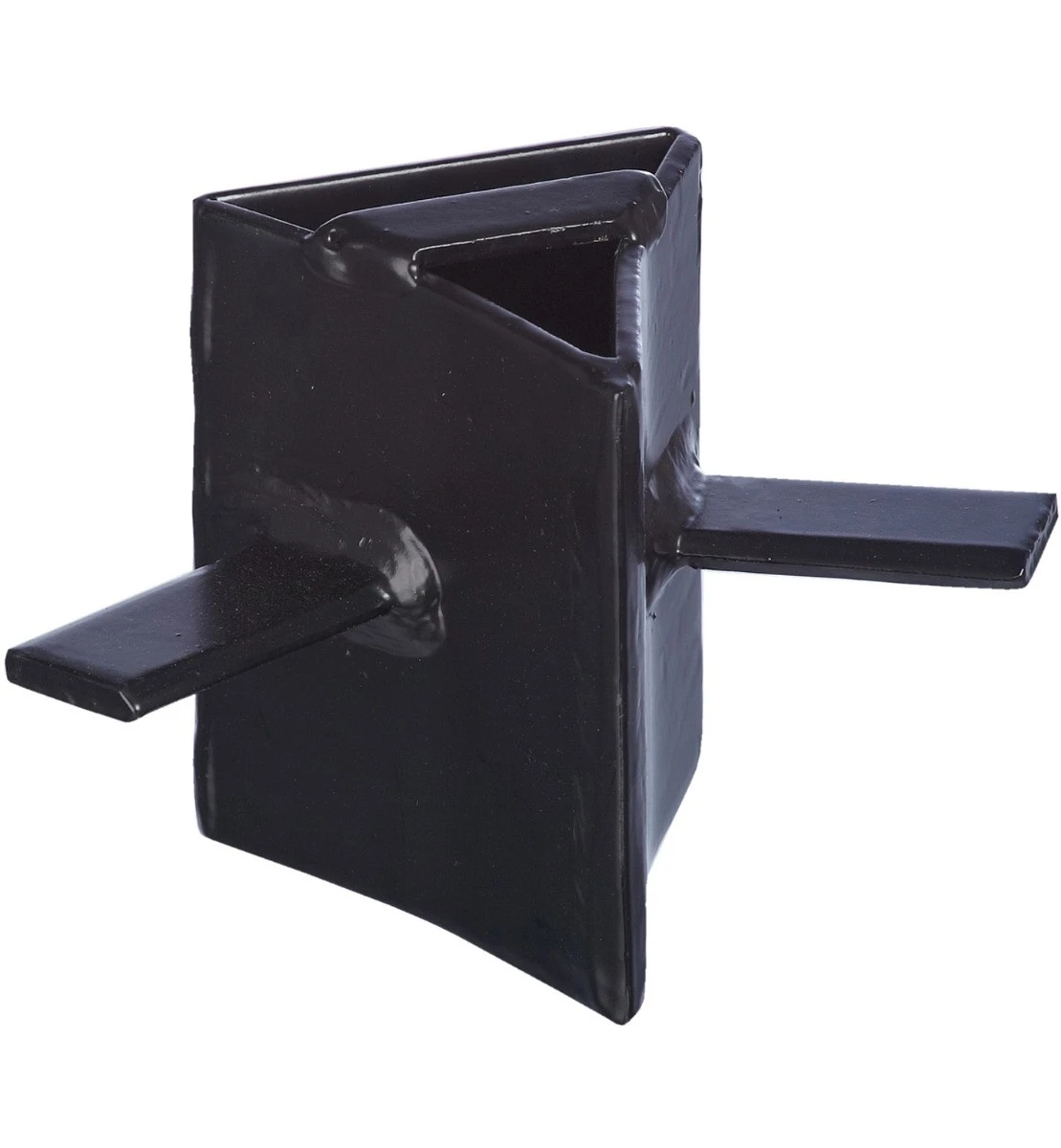Neljään osaan halkaiseva ristihalkaisuvaste Timcon 6T halkomakoneeseen. Mustaksi maalattua massiiviterästä.